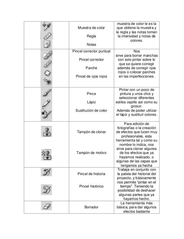 - . muestra de color le es la Muestra de color que obtiene la muestra y la regla y las notas toman Regla la intensidad y notas de colores. NotasPincel corrector puntual Nos sirve para borrar manchas Pincel corrector con solo pintar sobre lo que se quiere corregir Parche además de corregir ojos rojos o colocar parches Pincel de ojos rojos en las imperfecciones. Pintar con un poco de Pince pintura y unos clics y seleccionar diferentes Lápiz estilos cepillo así como su grosor. Sustitución de color Además de poder utilizar el lápiz y sustituir colores. Para edición de fotografías o la creación Tampón de clonar de efectos que lucen muy profesionales, esta herramienta tal y como su nombre lo indica, nos sirve para clonar algunos Tampón de motivo de los efectos que ya hayamos realizado, o algunas de las capas que tengamos ya hecha Trabaja en conjunto con Pincel de historia la paleta del historial del proyecto, y básicamente nos permite “pintar en el Pincel histórico tiempo”. Teniendo la posibilidad de deshacer algunas partes que ya hayamos hecho. La herramienta más Borrador básica, para dar algunos efectos bastante
