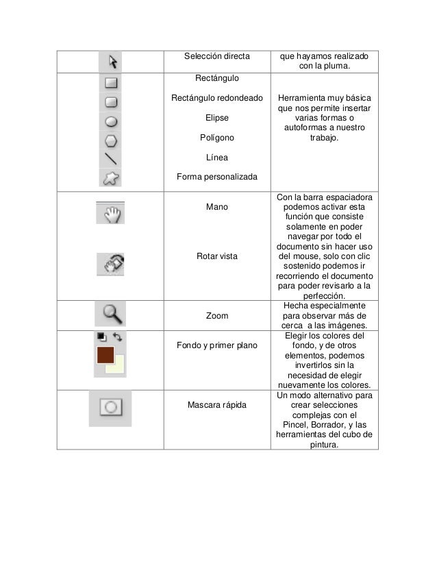 - Selección directa que hayamos realizado con la pluma. Rectángulo redondeado Herramienta muy básica que nos permite insertar Elipse varias formas o auto formas a nuestro Polígono trabajo. Línea Forma personalizada Con la barra espaciadora Mano podemos activar esta función que consiste solamente en poder navegar por todo el documento sin hacer uso Rotar vista del mouse, solo con clic sostenido podemos ir recorriendo el documento para poder revisarlo a la perfección. Hecha especialmente Zoom para observar más de cerca a las imágenes. Elegir los colores del Fondo y primer plano fondo, y de otros elementos, podemos invertirlos sin la necesidad de elegir nuevamente los colores. Un modo alternativo para Mascara rápida crear selecciones complejas con el Pincel, Borrador, y las herramientas del cubo de pintura.