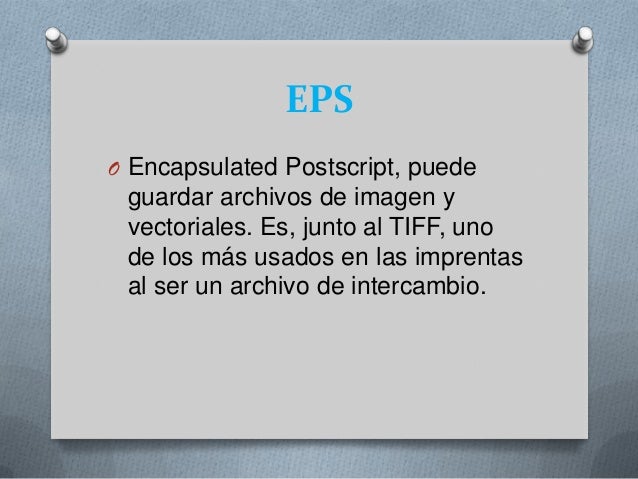 - . EPSO Encapsulated Postscript, puede guardar archivos de imagen y vectoriales. Es, junto al TIFF, unode los más usados en las imprenta sal ser un archivo de intercambio.