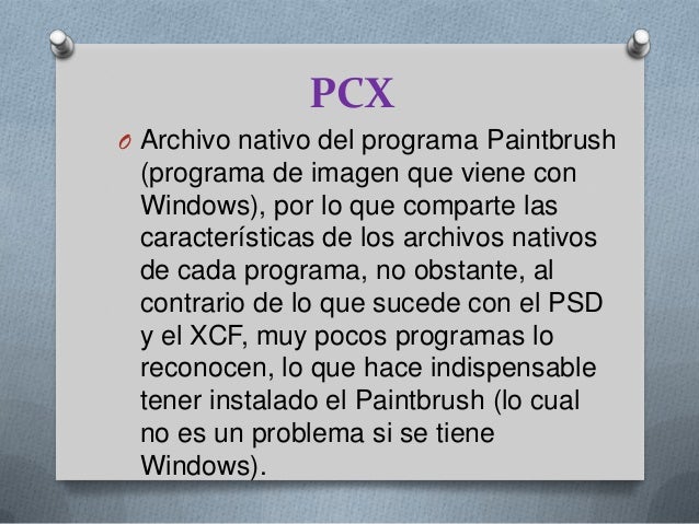 - . PCXO Archivo nativo del programa Paintbrush(programa de imagen que viene conWindows), por lo que comparte las características de los archivos nativos de cada programa, no obstante, al contrario de lo que sucede con el PSDy el XCF, muy pocos programas lo reconocen, lo que hace indispensable tener instalado el Paintbrush (lo cual no es un problema si se tieneWindows).