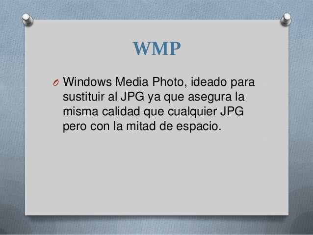 - . WMPO Windows Media Photo, ideado para sustituir al JPG ya que asegura la misma calidad que cualquier JPGpero con la mitad de espacio.