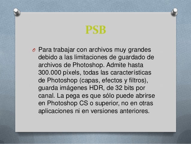 - . PSBO Para trabajar con archivos muy grandes debido a las limitaciones de guardado de archivos de Photoshop. Admite hasta300.000 píxels, todas las características de Photoshop (capas, efectos y filtros),guarda imágenes HDR, de 32 bits por canal. La pega es que sólo puede abrirse en Photoshop CS o superior, no en otras aplicaciones ni en versiones anteriores.