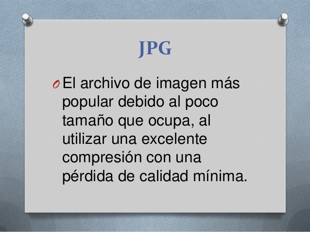 - . JPGOEl archivo de imagen más popular debido al poco tamaño que ocupa, al utilizar una excelente compresión con una pérdida de calidad mínima.
