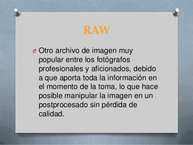 - . RAWO Otro archivo de imagen muy popular entre los fotógrafos profesionales y aficionados, debido a que aporta toda la información en el momento de la toma, lo que hace posible manipular la imagen en un post procesado sin pérdida de calidad.