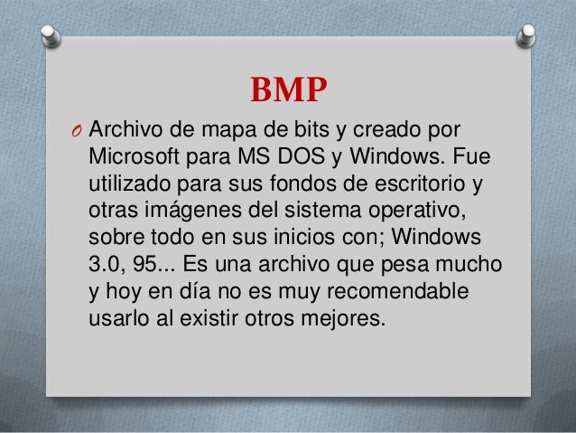 - . BMPO Archivo de mapa de bits y creado por Microsoft para MS DOS y Windows. Fue utilizado para sus fondos de escritorio y otras imágenes del sistema operativo,sobre todo en sus inicios con; Windows3.0, 95... Es una archivo que pesa mucho y hoy en día no es muy recomendable usarlo al existir otros mejores.