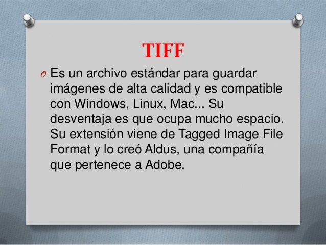 - . TIFFO Es un archivo estándar para guardar imágenes de alta calidad y es compatible con Windows, Linux, Mac... Su desventaja es que ocupa mucho espacio.Su extensión viene de Tagged Image FileFormat y lo creó Aldus, una compañía que pertenece a Adobe.