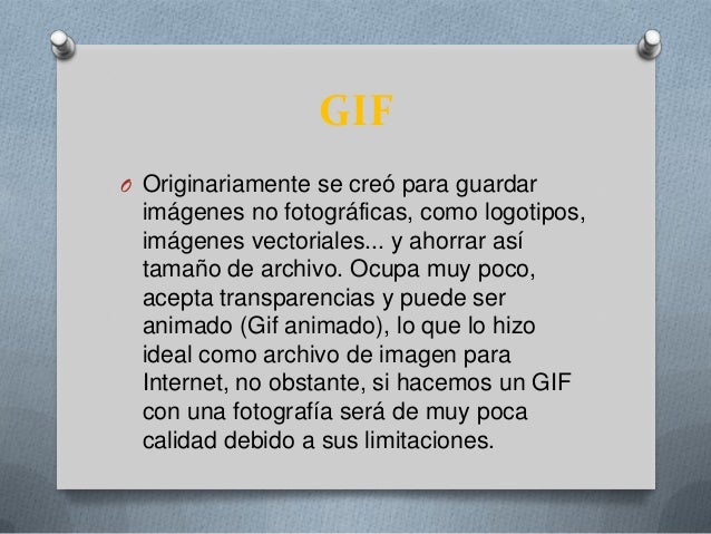 - . GIFO Originariamente se creó para guardar imágenes no fotográficas, como logotipos,imágenes vectoriales... y ahorrar as ítamaño de archivo. Ocupa muy poco,acepta transparencias y puede ser animado (Gif animado), lo que lo hizo ideal como archivo de imagen para Internet, no obstante, si hacemos un GIFcon una fotografía será de muy poca calidad debido a sus limitaciones.