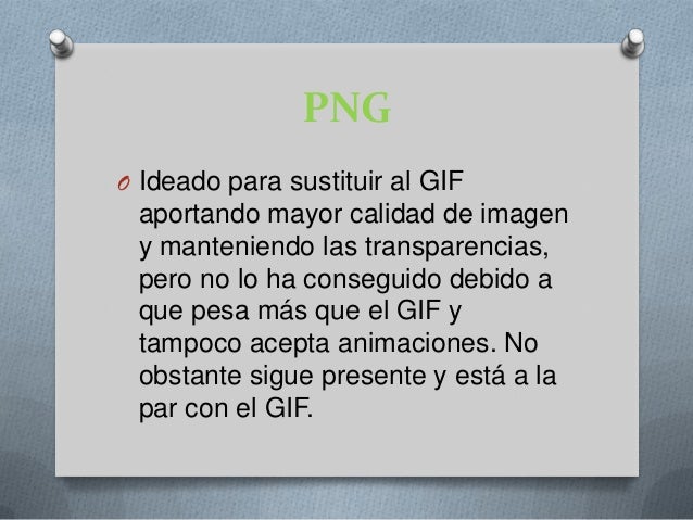 - . PNGO Ideado para sustituir al GIF aportando mayor calidad de imagen y manteniendo las transparencias,pero no lo ha conseguido debido a que pesa más que el GIF y tampoco acepta animaciones. No obstante sigue presente y está a lapar con el GIF.